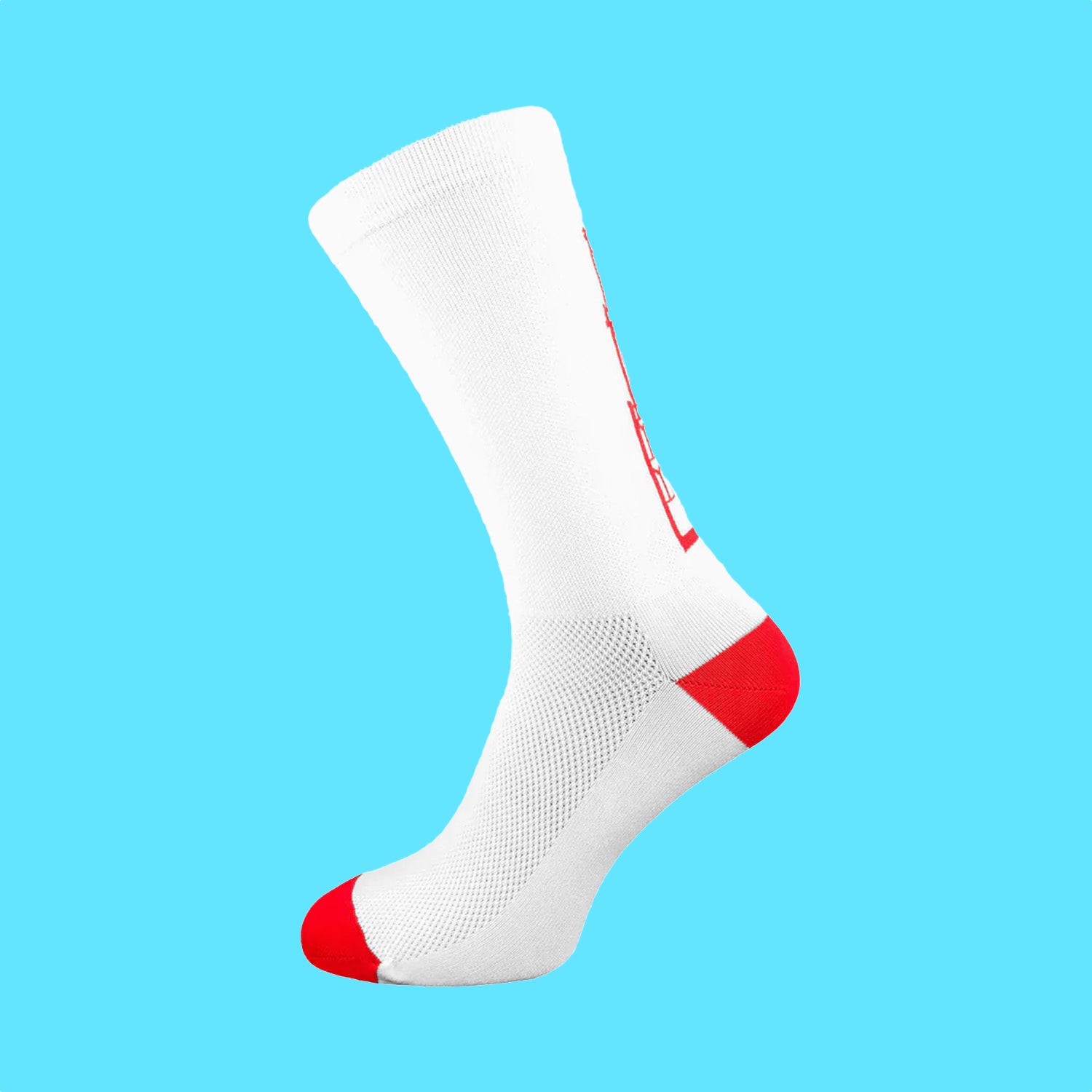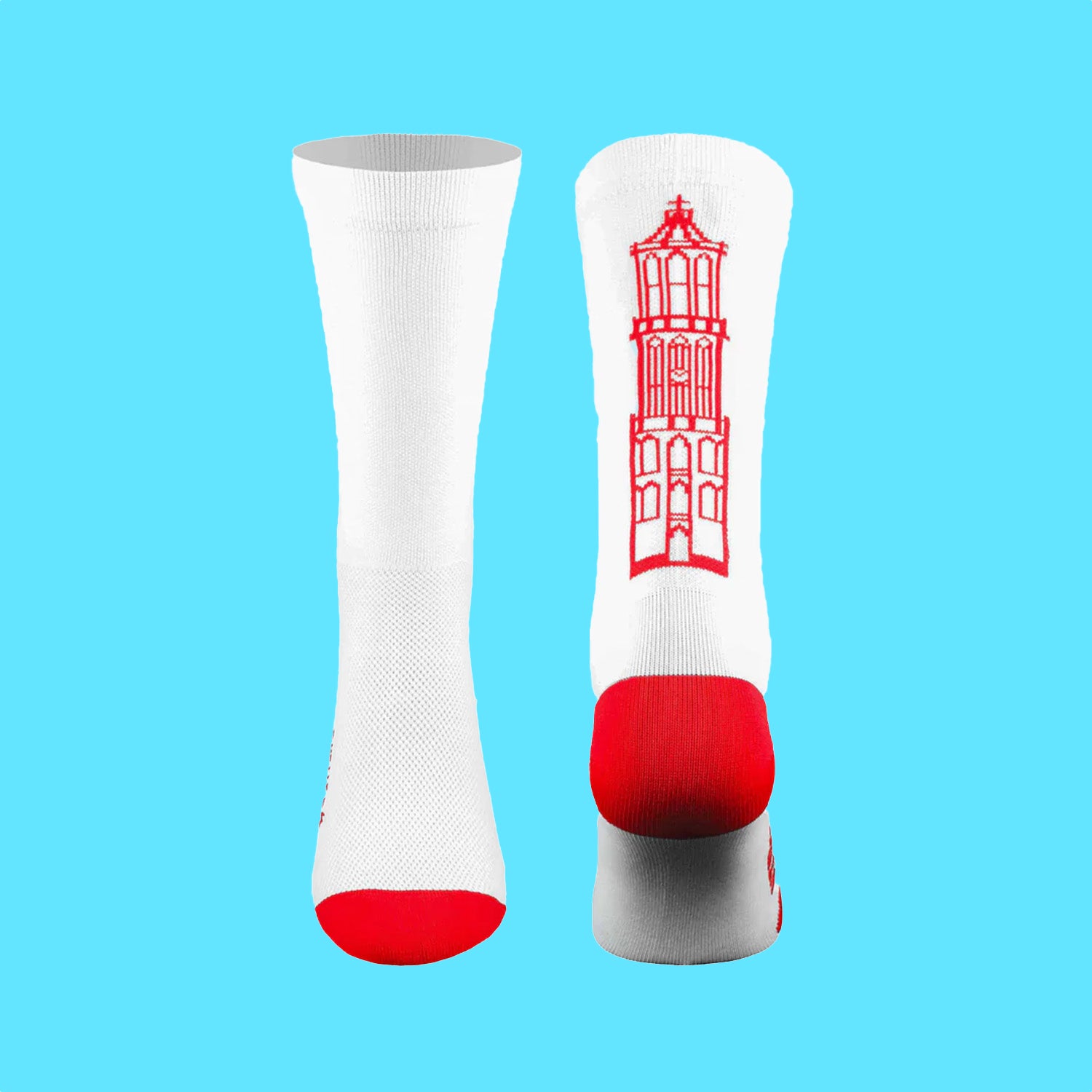 Laat zien dat je hart in de Domstad ligt. Met deze hoge, witte fietssokken en de iconische rode Domtoren ben jij de snelste én meest stijlvolle renner van het peloton.