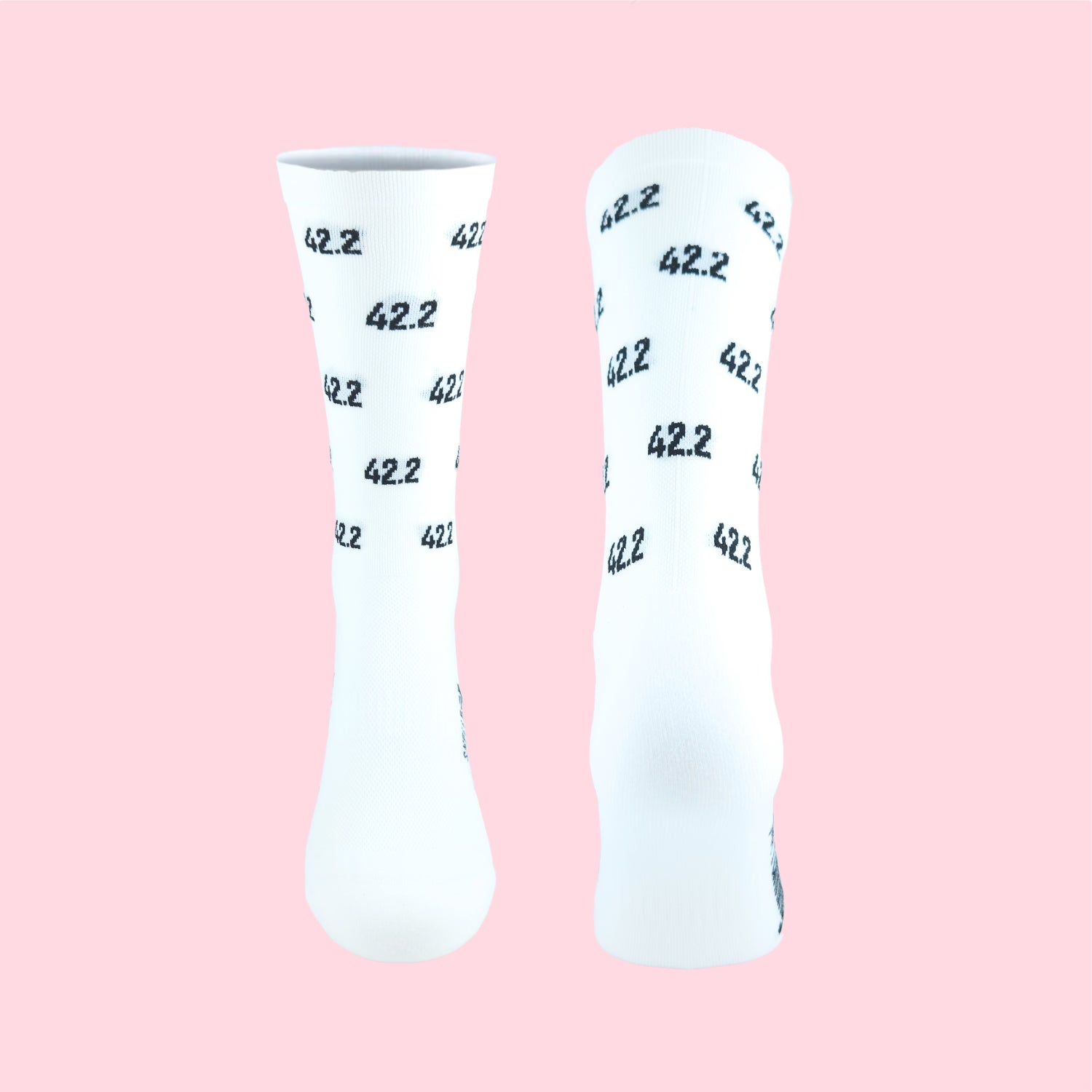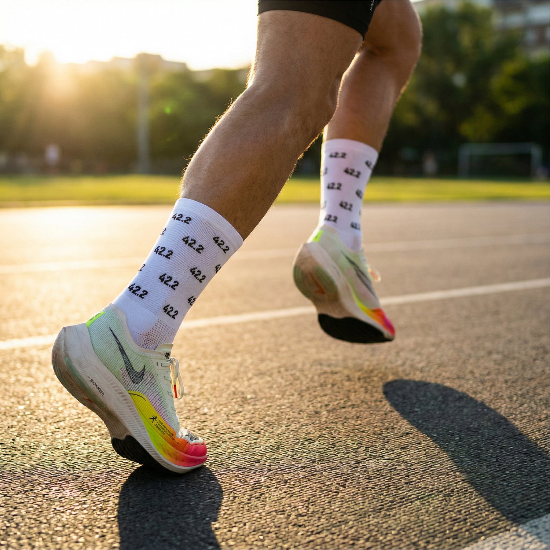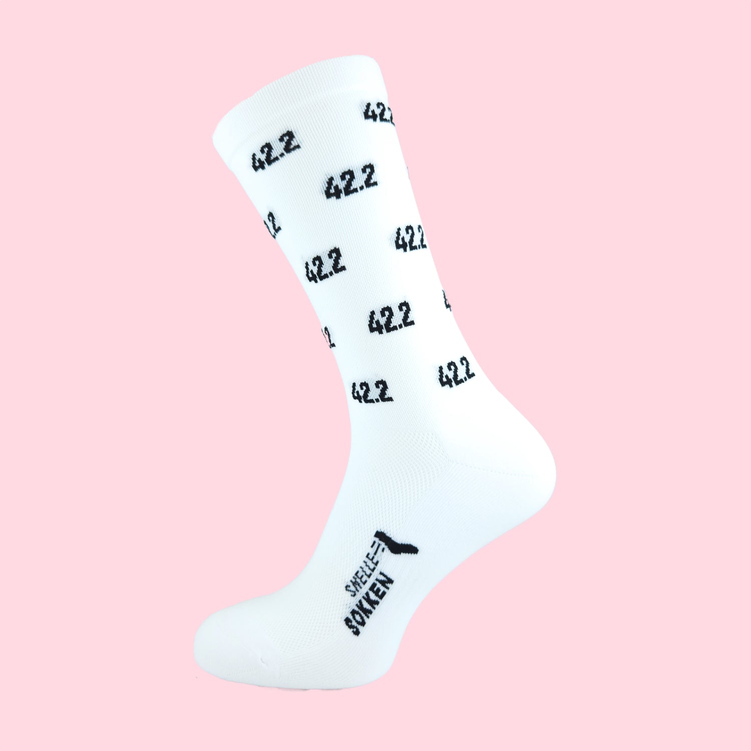 Onze witte hardloopsokken met 42.2 print zijn speciaal ontworpen voor lange afstanden. Gemaakt in Europa van ademend nylon, bieden ze optimale ondersteuning, snelle vochtafvoer en een perfect aansluitende pasvorm. Ideaal voor elke loper die comfort zoekt tijdens trainingen én marathons.