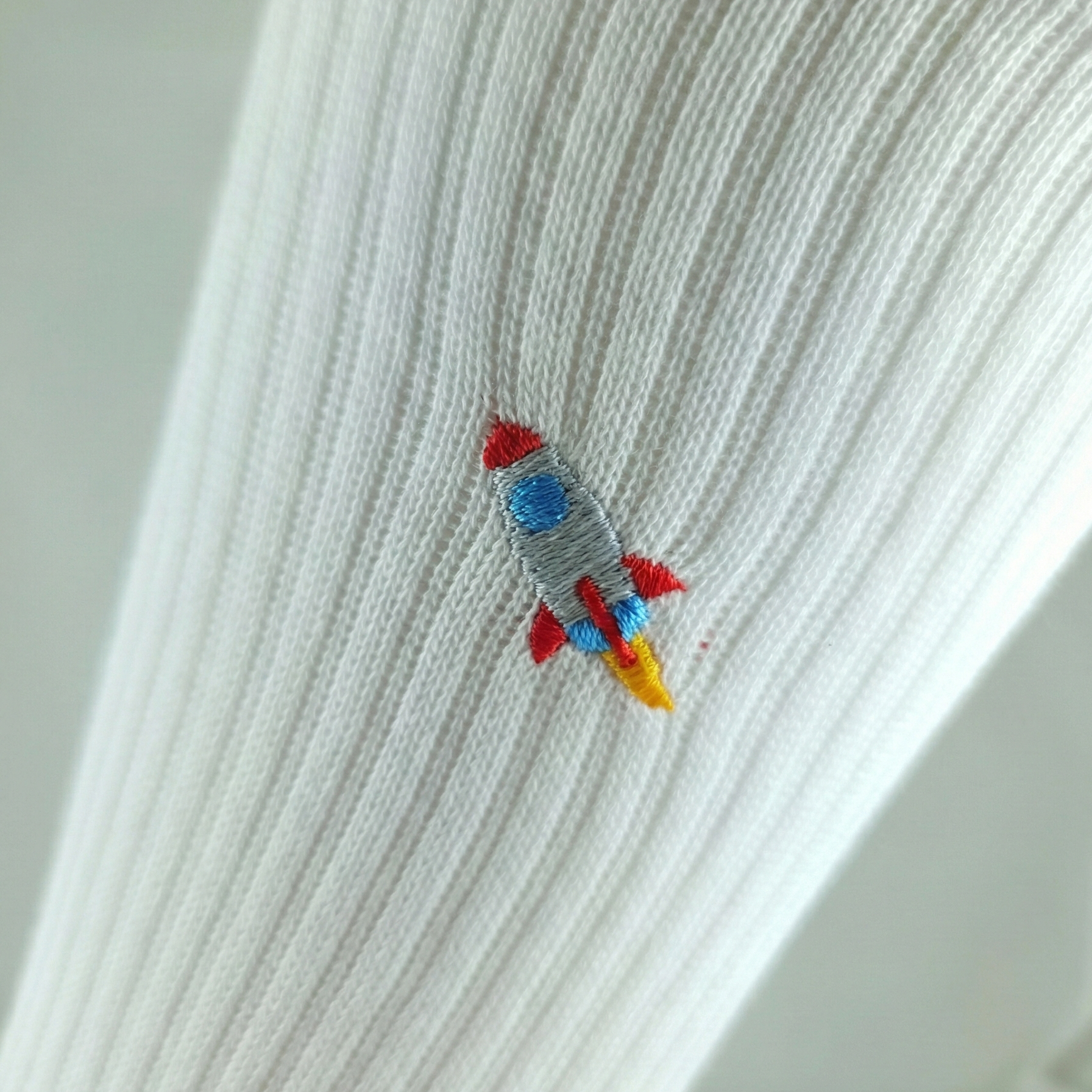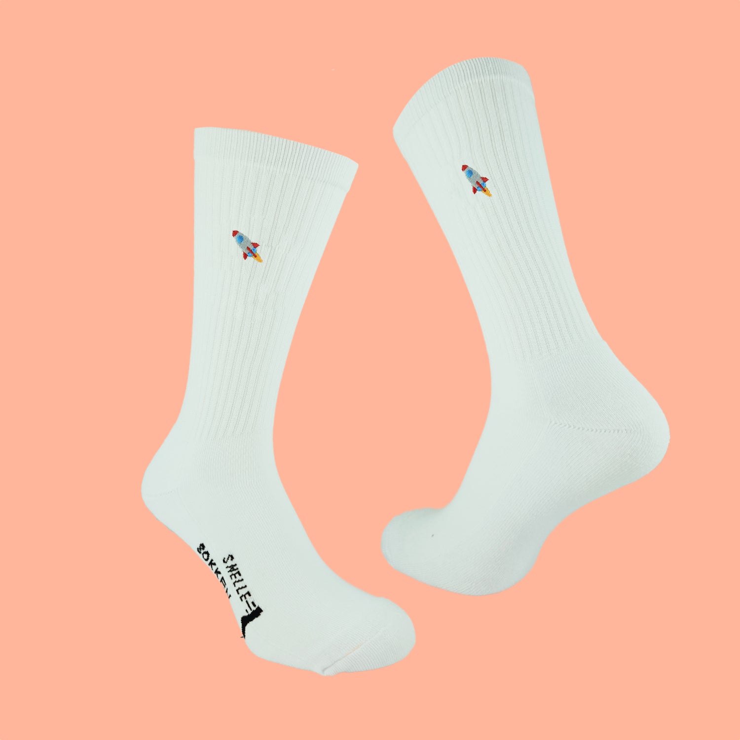 Sla een nieuwe weg in met deze witte crew sokken met maanraket borduur. Of je nu grootse plannen hebt of gewoon met beide benen op de grond blijft staan; deze sokken tillen je outfit naar een hoger niveau. Een perfecte mix van een avontuurlijk design en aardse degelijkheid.