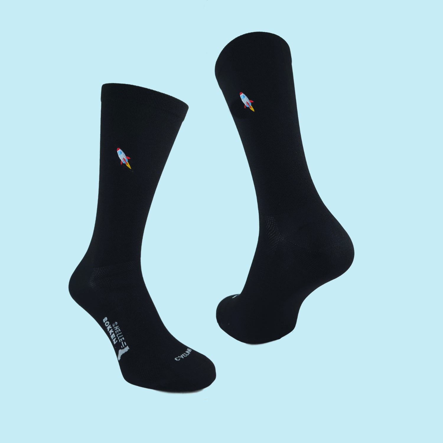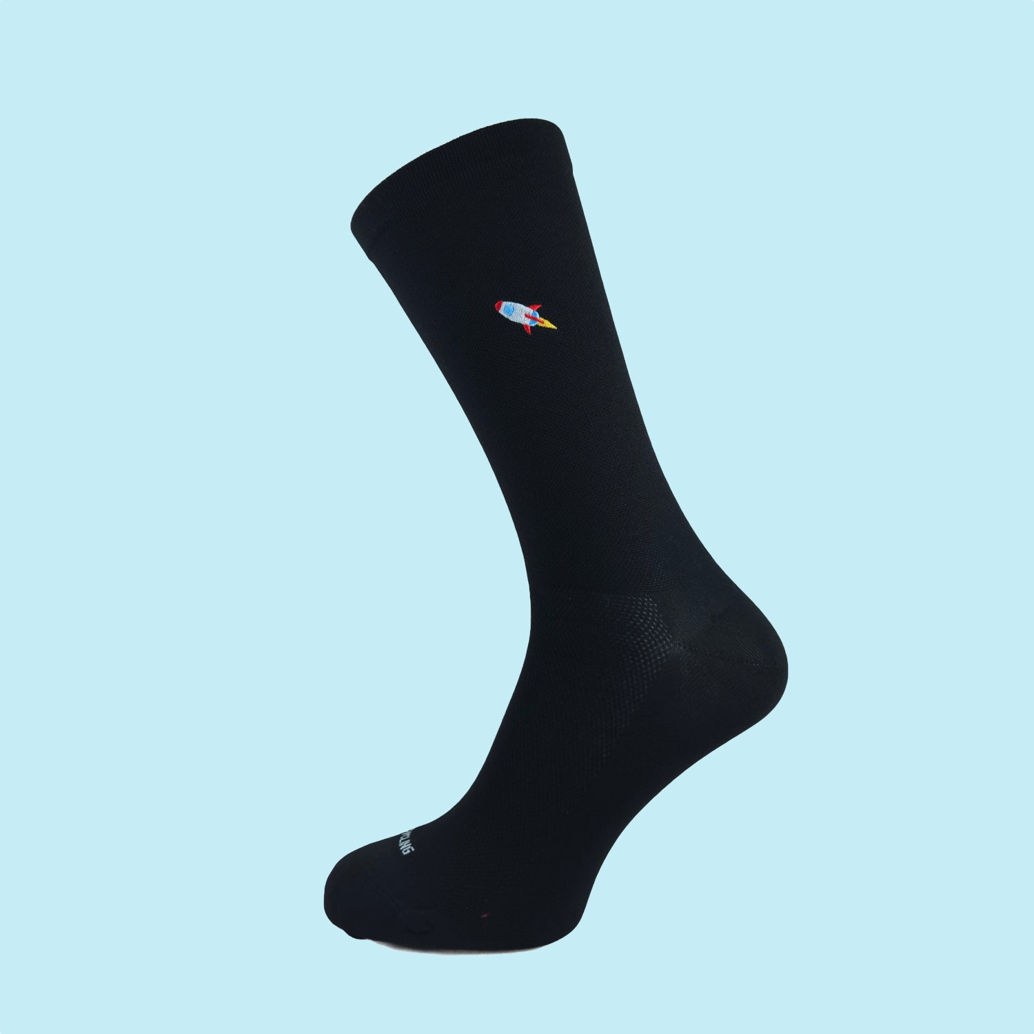 Hoge zwarte fietssokken met raketborduursel – stijlvol, comfortabel en gemaakt voor snelheid.