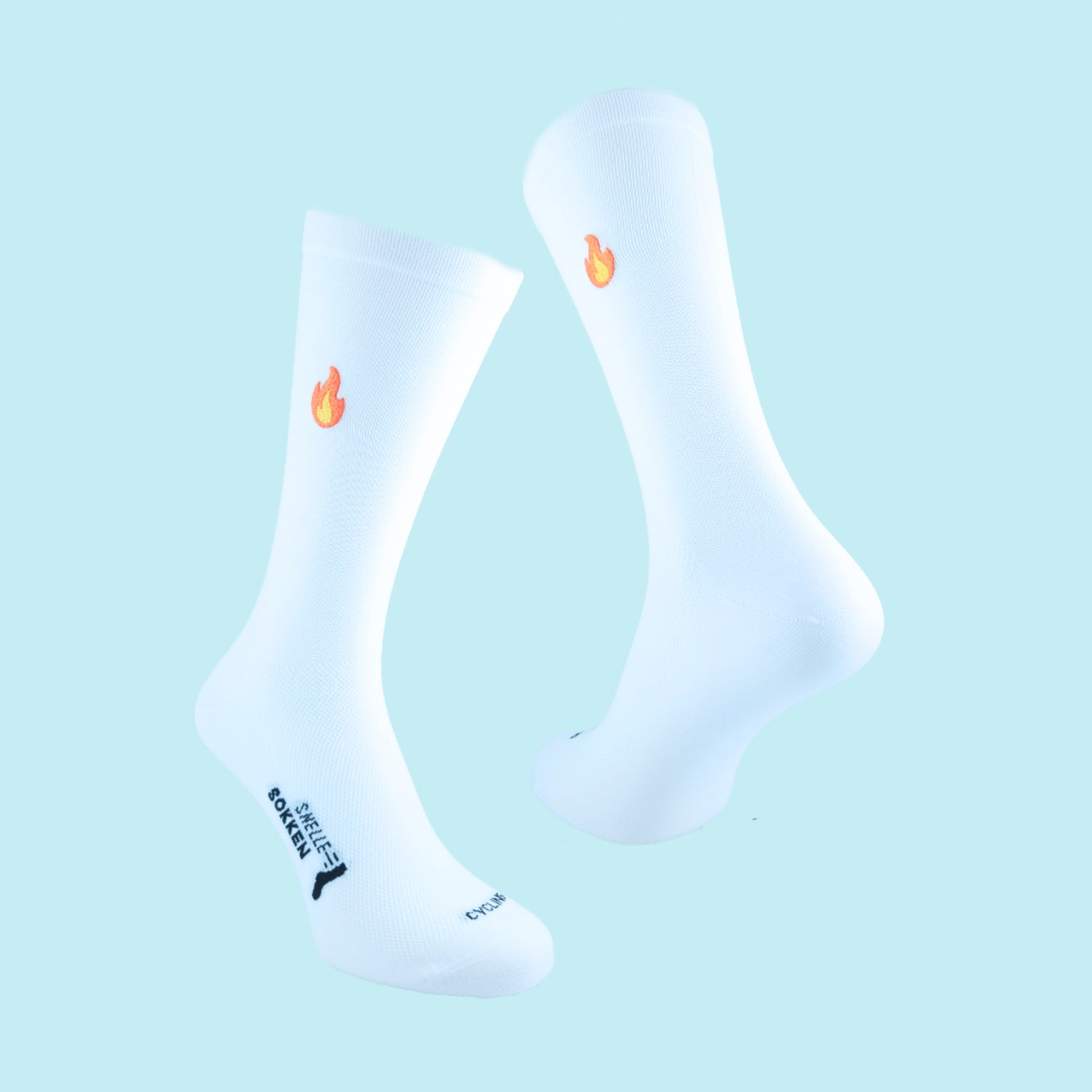 Maak kennis met de witte hoge fietssokken met vlammenborduursel van Snelle Sokken – dé perfecte mix van stijl, comfort en performance. Deze sokken zijn gemaakt voor fietsers die niet bang zijn om een statement te maken. Want zeg eerlijk: wie wil er nou niet met vuur in de benen rijden?