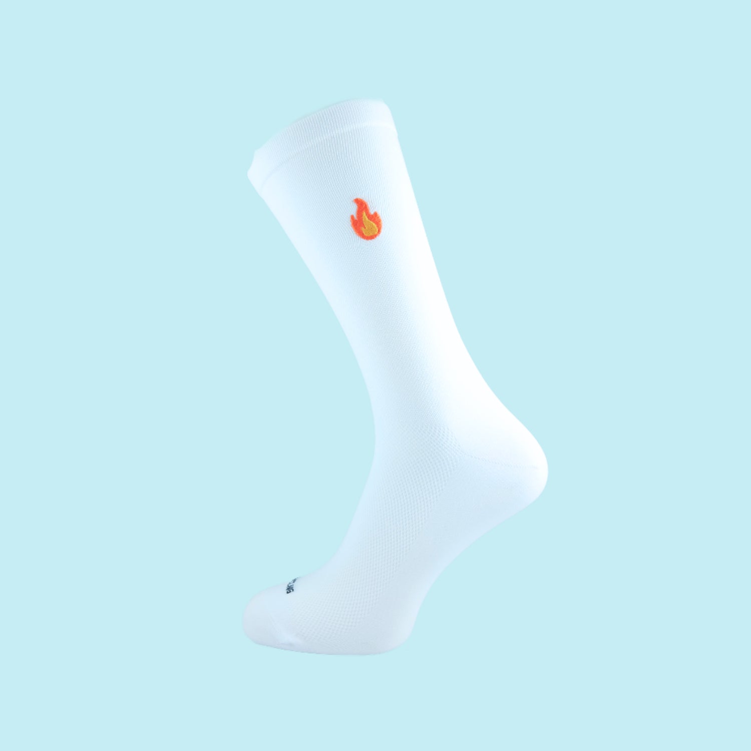 Het vlammenborduursel op de enkel geeft deze witte fietssokken hun unieke karakter. Subtiel genoeg om stijlvol te blijven, maar opvallend genoeg om te laten zien dat jij snelheid én humor in de benen hebt. Perfect voor op de racefiets, gravelbike of mountainbike.
