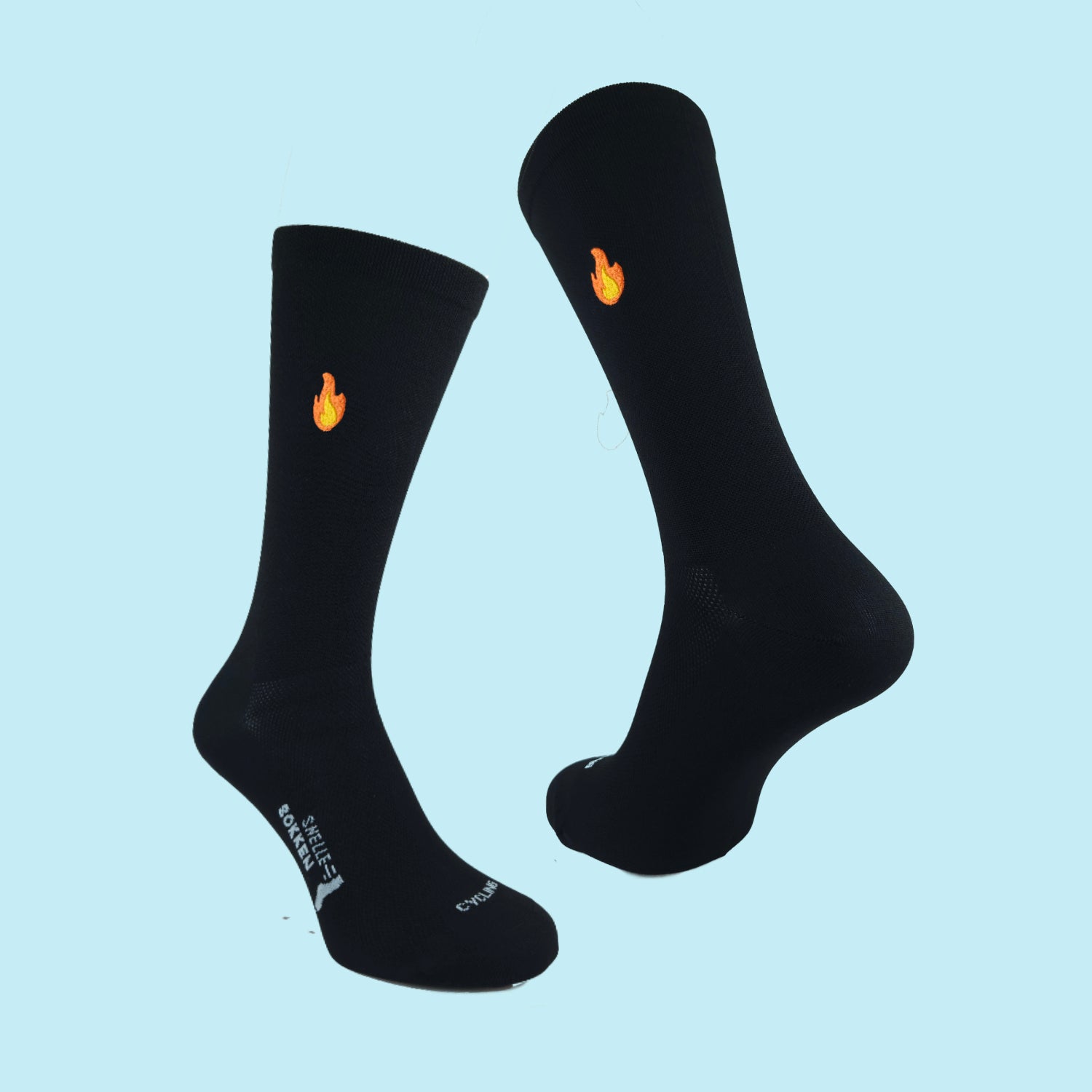 Ontsteek je volgende rit met deze zwarte hoge fietssokken met vlammenborduursel – exclusief van Snelle Sokken.