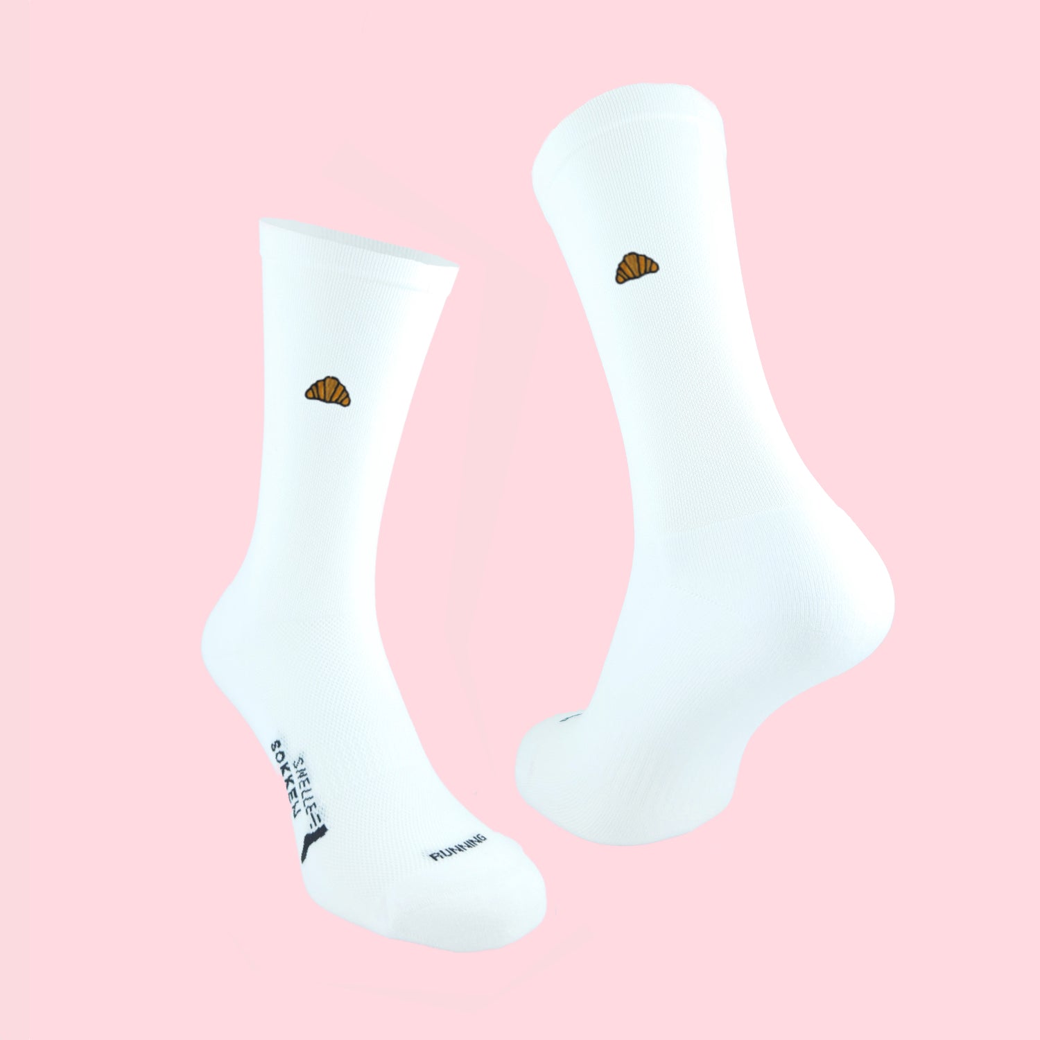 Start je run met smaak en stijl in deze frisse witte hardloopsokken. Het unieke detail zit hem in het geborduurde croissantje op de schacht. Dit is geen standaard platte print, maar hoogwaardig borduurwerk dat mooi op de stof ligt. Dit zorgt voor een luxe 3D-effect en geeft je outfit net die speelse, Franse twist.
