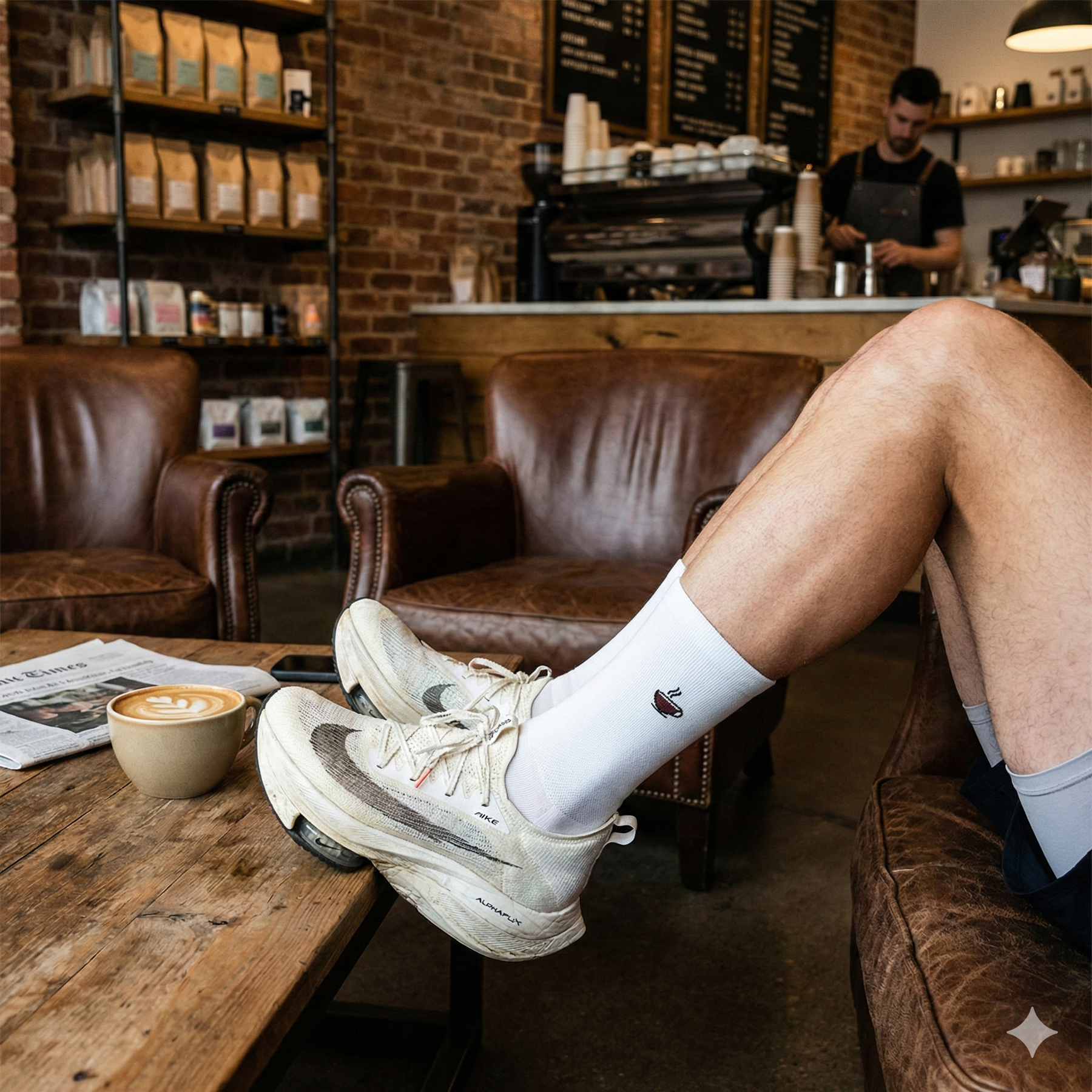 Laat zien waar jij je energie vandaan haalt met deze cleane witte hardloopsokken. De blikvanger is het subtiele geborduurde koffiekopje op de enkel. Omdat het icoontje echt in de stof is gestikt en niet geprint, ligt het mooi op de oppervlakte. Dit zorgt voor een luxe 3D-effect en een uitstraling die net zo krachtig is als een dubbele espresso.