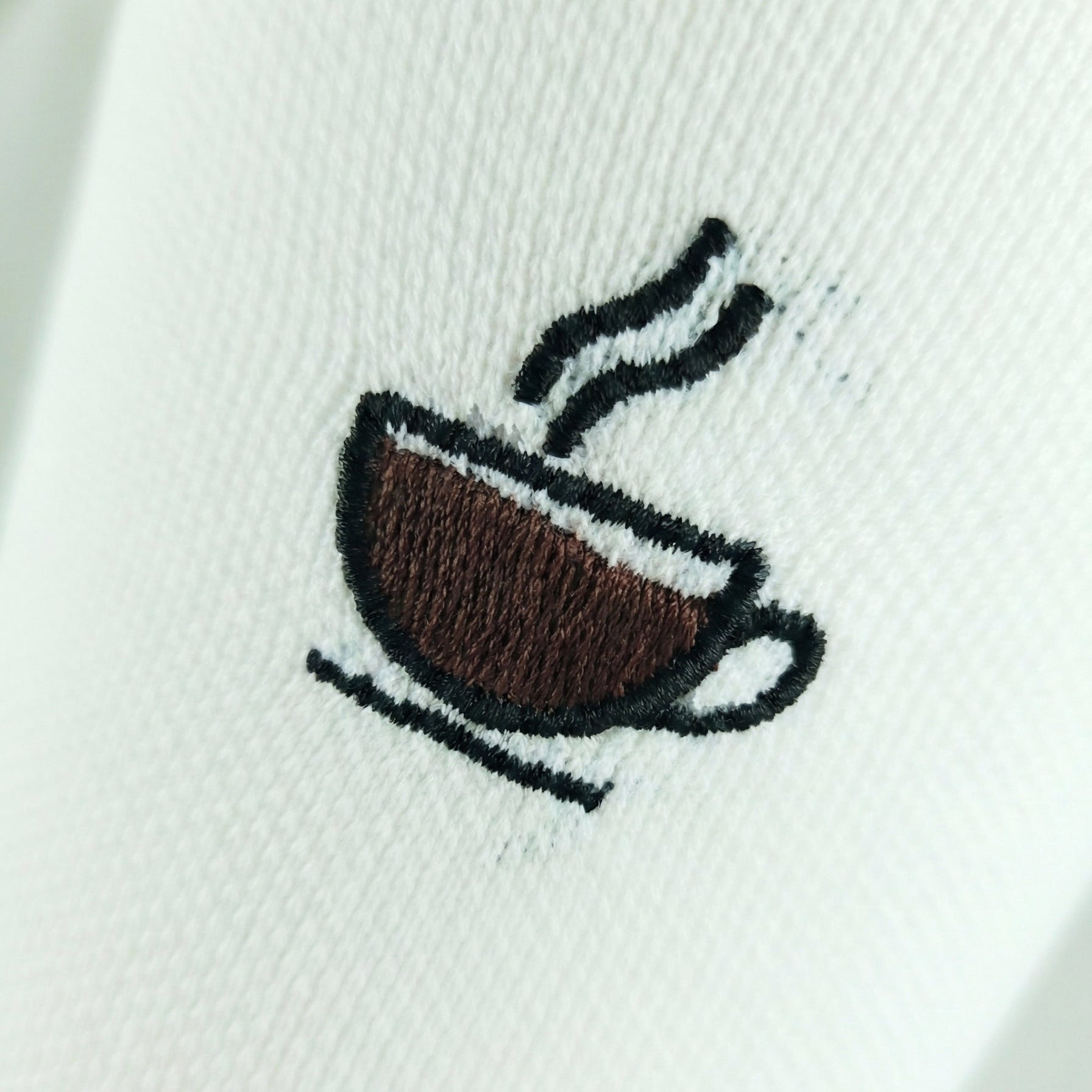 Design: Wit met geborduurd koffiekopje (voelbaar 3D-effect).