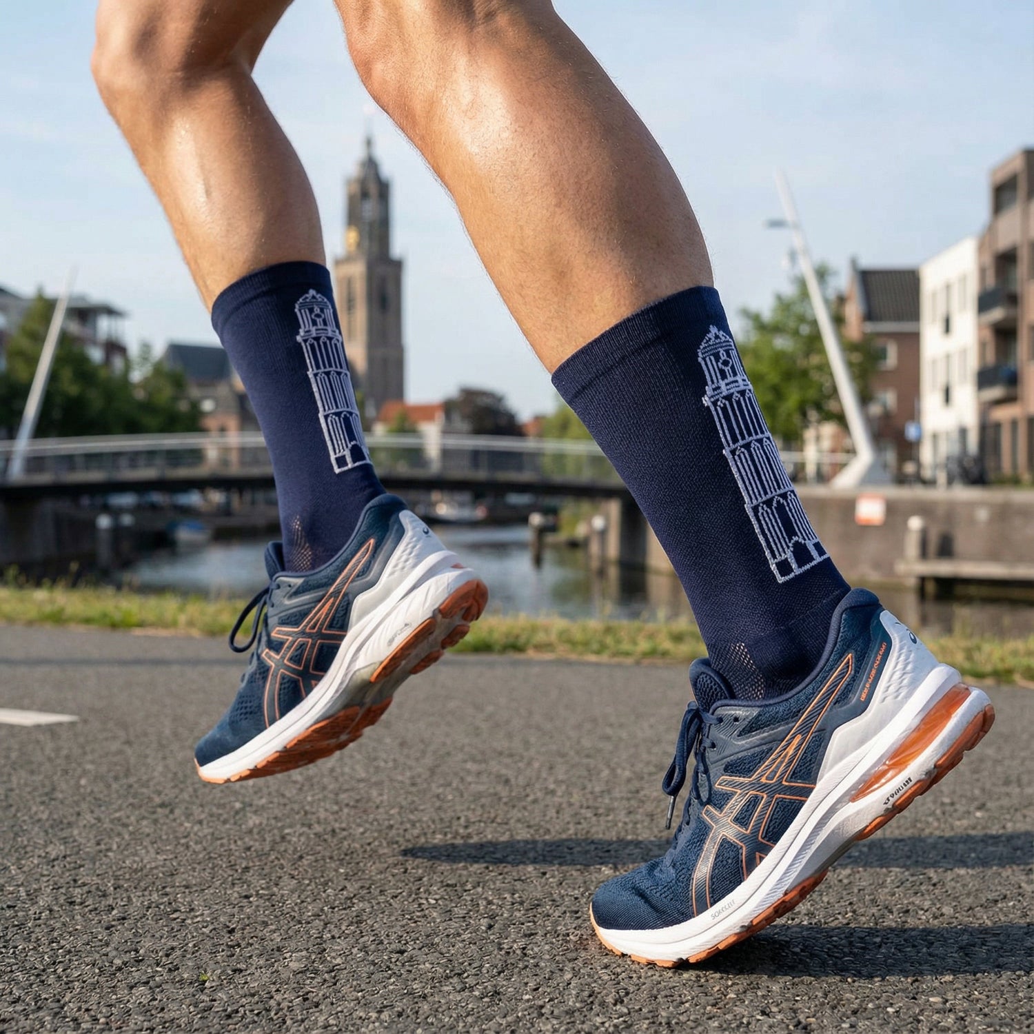 Het strakke donkerblauwe design met de witte Peperbus maakt deze sokken niet alleen functioneel, maar ook stijlvol. Perfect om je liefde voor Zwolle te tonen of als origineel cadeau voor een hardloopmaatje.
